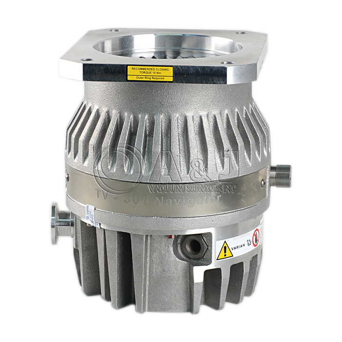 The Varian TV 301, V301 9698918M002 Navigator is an integrated system with a turbomolecular pump for high and ultra-high vacuum applications with its relevant controller. The system can pump any type of gas or gas compound. It is not suitable for pumping liquids or solid particles. The pumping action is obtained through a high speed turbine (max. 56000 rpm) driven by a high-performance 3-phase electric motor. The TV 301 Navigator is free of contaminating agents and, therefore, is suitable for applications requiring a "clean" vacuum. It is equipped with auxiliary connectors to supply an additional fan, to control the vent valve, to be controlled from a remote site by means of an host computer connected through a serial line (RS232 or RS485). The TV 301 Tubro Pump is available in four different models that differ only in the high vacuum flange. The pump consists of a high frequency motor driving a turbine fitted with 8 bladed stages and 3 Macrotorr stages. The turbine rotates in an anticlockwise direction when viewed from the high vacuum flange end. The turbine is made of high-strength aluminium alloy, machined from a single block. The Macrotorr stages are in the form of four discs. The turbine rotor is supported by permanently lubricated high precision ceramic ball bearings installed on the forevacuum side of the pump. The static blades of the stator are made of stainless steel. These are supported and accurately positioned by spacer rings. The Macrotorr stators are in the form of selfpositioning machined discs with pumping channels and an opening restricted by the corresponding rotor discs. These are made of aluminium alloy.