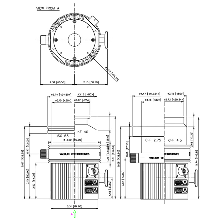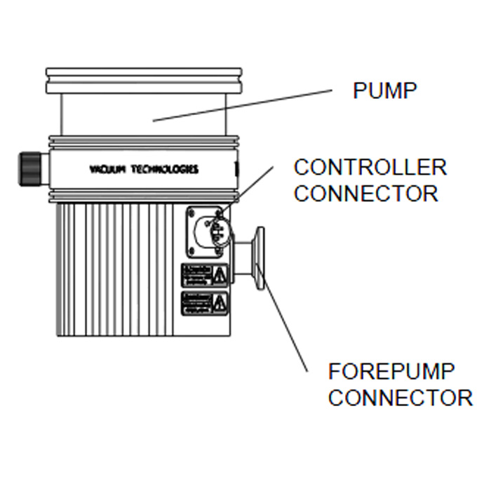 The V 81T turbo pump is balanced after assembly with a residual vibration amplitude less than 0.01. The pump can operate in any position and can be supported on the high vacuum flange. The connection of the forevacuum on the side of the pump is a KF 16 NW flange.