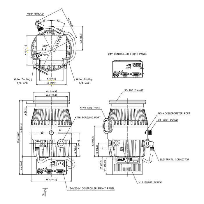 During normal operation, the motor is fed with a voltage of 54 Vac three-phase at 933 Hz. To reduce losses during start-up to a minimum, the frequency increases according to a ramp with a higher initial voltage/frequency ratio. The pump can be water cooled or air cooled: in the first case the customer can use the dedicated channels on the pump body, in the second case an external optional fan is available. A thermistor sensor is mounted near the upper bearing to prevent the pump from overheating. The pump is balanced after assembly with a residual vibration amplitude less than 0.01. The pump can operate in any position and can be supported on the high vacuum flange. The connection of the forevacuum on the side of the pump is a KF 16 NW flange.
