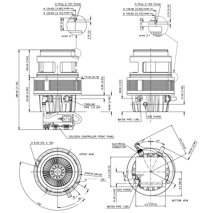 The nominal rotational speed is 60 krpm. The pump can be water cooled or air cooled: in the first case the customer can use the dedicated channels on the pump body, in the second case an external optional fan is available. A thermistor sensor is mounted near the upper bearing to prevent the pump from overheating. The pump can operate in any position and must be supported on the flange.