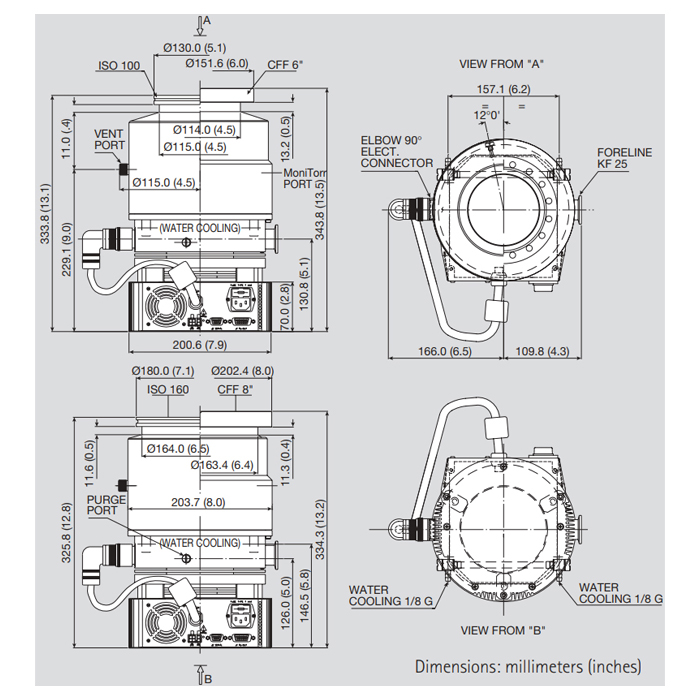 The Agilent Varian TV 551 Navigator pump is balanced after assembly with a residual vibration amplitude less than 0.01. The pump can operate in any position and can be supported on the high vacuum flange. The connection of the forevacuum on the side of the pump is a KF 25 NW flange.