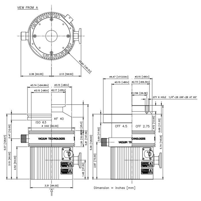 The V 81T turbo pump is balanced after assembly with a residual vibration amplitude less than 0.01. The pump can operate in any position and can be supported on the high vacuum flange. The connection of the forevacuum on the side of the pump is a KF 16 NW flange.