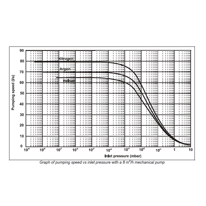 The TV 81 pump can be water cooled or air cooled: in the first case the customer can use a dedicated external plate made of nickel-plated brass, in the second case an external optional fan is available. A thermistor sensor is mounted near the upper bearing to prevent the pump from overheating. The pump is balanced after assembly with a residual vibration amplitude less than 0.01. The pump can operate in any position and can be supported on the high vacuum flange.