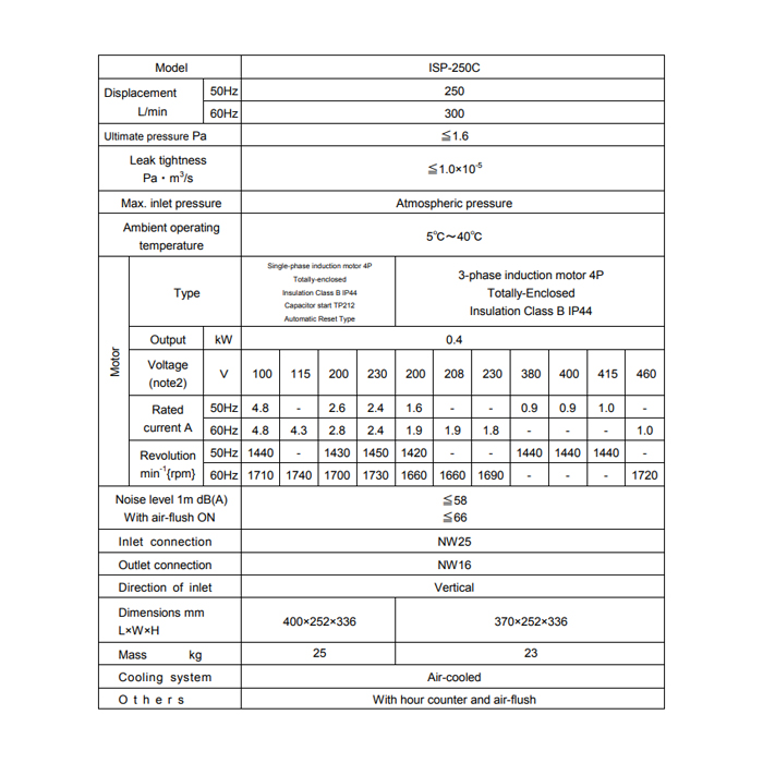 The ISP-250 C Scroll Vacuum Pump should be used at ambient operation temperature in the range of 5ºC to 40ºC.