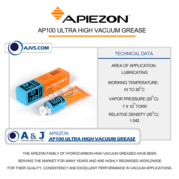 The grease is an ultra-high vacuum lubricating grease which has anti-seize properties, making it an effective protector and lubricant in ultra high vacuum applications. It demonstrates an extremely low water vapor pressure of 7 x 10^[-11] Torr at 20 degrees Celsius. It is recommended for use at ambient temperatures and does not suffer from the contamination problems associated with silicone-based greases (these include commonly-recognized phenomena such as "creep" or "carry-over"). Apiezon AP100 grease is relatively easy to clean and remove using hot water and an aqueous glassware detergent, hydrocarbon or chlorinated solvents.