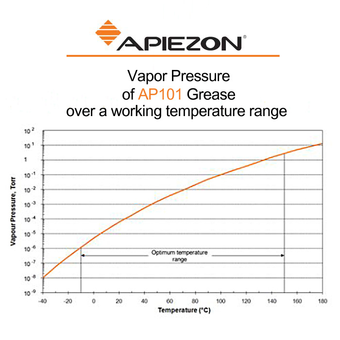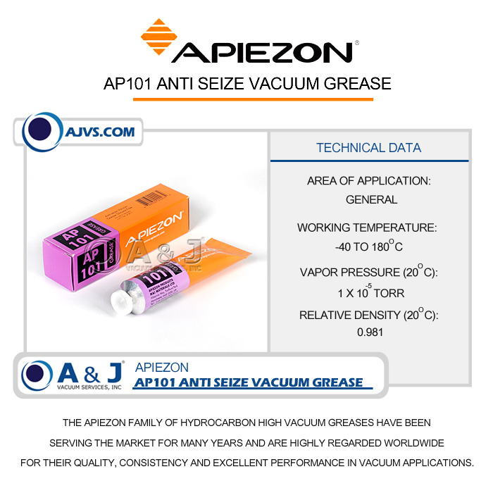 The vacuum grease is ideally suited for use within low-to-medium vacuum ranges featuring vapor pressures below 10^[-5] Torr at 20 degrees Celsius.The grease contains anti-seize properties, making the Apiezon AP 101 an effective protector and lubricant for metal surfaces that may otherwise be subject to seizure or corrosion. Apiezon AP 101 is insoluble in most standard solvents and is resistant to water, alcohols, ketones and esters.