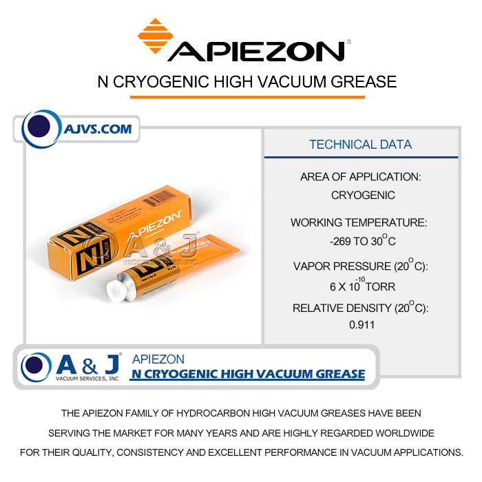 Apiezon N Grease is silicone-free and widely recognized and recommended as the cryogenic vacuum grease of choice. This cryogenic grease is specially formulated to exhibit craze-free performance characteristics at low temperatures and withstand frequent cycling between cryogenic temperatures ranging as low as -273 degrees Celsius.