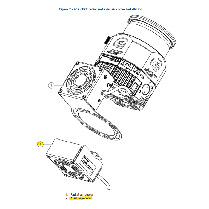 The ACX nEXT air coolers are available for both radial and axial mounting. It is possible to use both variants simultaneously if so desired and space allows. TICs can provide power for one fan only.