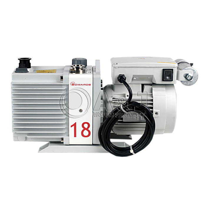 The Edwards E2M18 Rotary Vane Pump is a vacuum pump that has a pressurized oil system that lubricates the pump shaft bearing surfaces and rotor sealing faces. The pump has an oil distribution valve which prevents discharge of oil to the pump interior (suckback) after the pump stops. The pumping chambers are air-tight, so this arrangement prevents oil suckback unless the gas ballast valve is open.