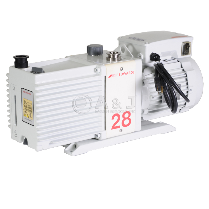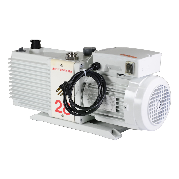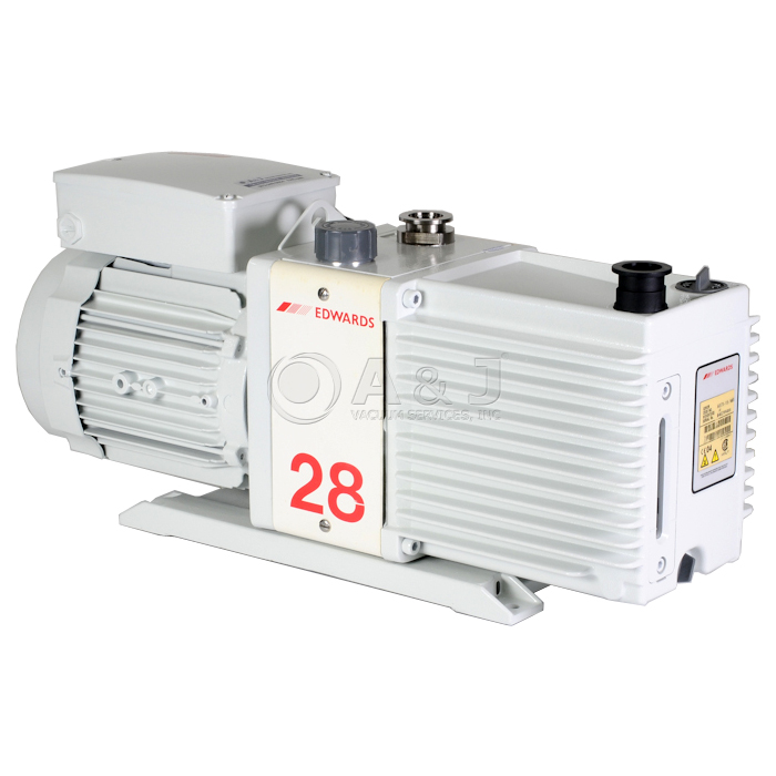 The Edwards E2M28 Rotary Vane Pump is a two-stage, direct drive, sliding vane pump. The pump is oil-sealed and designed for reliable, long-term operation in both laboratory and industrial environments. The E2M28 pump is a free-standing unit. The drive is provided through a flexible coupling by a single-phase or three-phase (four pole) motor.