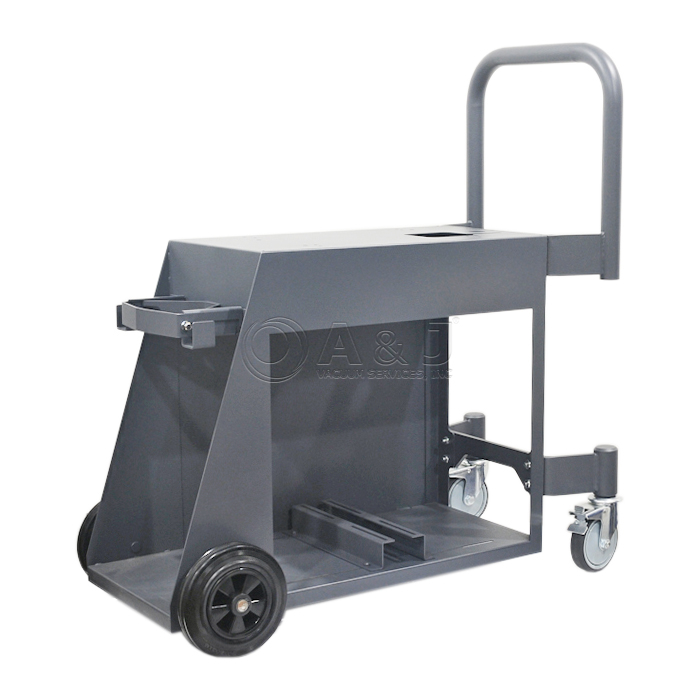 Edwards ELD 500 Cart with flexable helium bottle holder. The cart has a ergonomic handle and puts the ELD500 at a convenient workinh height. Flexible backing pump mounting on the bottom of the cart.