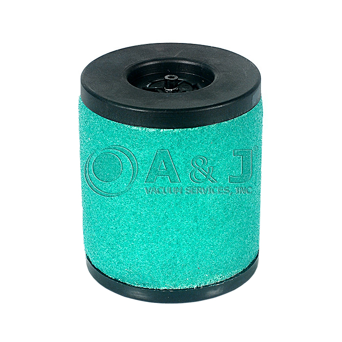 Exhaust gases from the pump travel upwards to the center of the Oil Mist Filter and through the filter element to the outside. Oil droplets that are trapped by the fiber composite element travel down the filter and collect in a reservoir in the base of the Oil Mist Filter.
