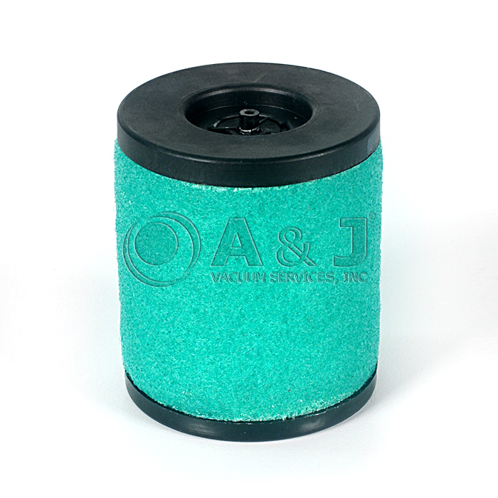 Exhaust gases from the pump travel upwards to the center of the Oil Mist Filter and through the filter element to the outside. Oil droplets that are trapped by the fiber composite element travel down the filter and collect in a reservoir in the base of the Oil Mist Filter.