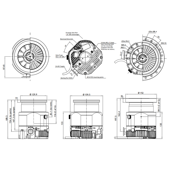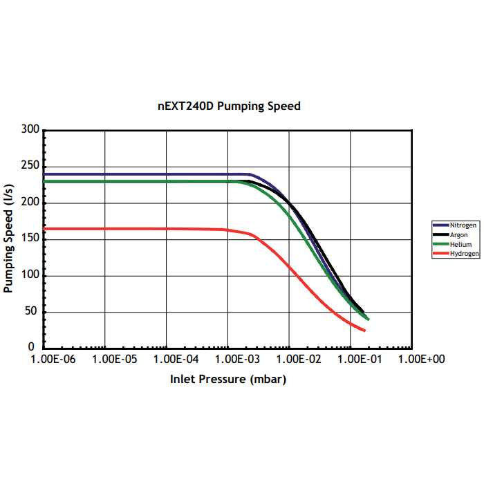 The nEXT 240D Turbo pumps consist of the turbomolecular pump with a permanently attached controller containing drive electronics.