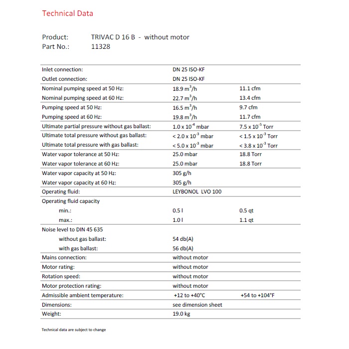 The LEYBOLD TRIVAC D16B vacuum pumps are oil lubricated vacuum pumps. Each Leybold D16B pump 11266 can be wired for low 230V 50/60 Hz Voltage or 400 V 50/60 Hz High Voltagge. The Leybold D 16 B is a well know vacuum pump with excelent reputation for vapor handling capability. The Leybold D16B pump has two vacuum stages with low vacuum and high vacuum which provided excelent ultimate vacuum pressure at < 2.0x10-3 mbar or <1.5x10-3 Torr. The Leybold D16B is perfectly suitable for many laboratory and research applications such as turbo pump backing pumps, diffusion pump backing pump, vacuum ovens, vacuum pumps for mass spectrometers, vacuum research laboratories, research projects. This Leybold D 16 B pump is prepared for Hydrocarbon oil service, best vacuum pump oil to be used is Leybonol LVO 100 / PN16787, D16 oil requirement 0.5 L min, 1.0 L max. The TRIVAC D16 Pump has grate water vapor capacity of 305 g/h.