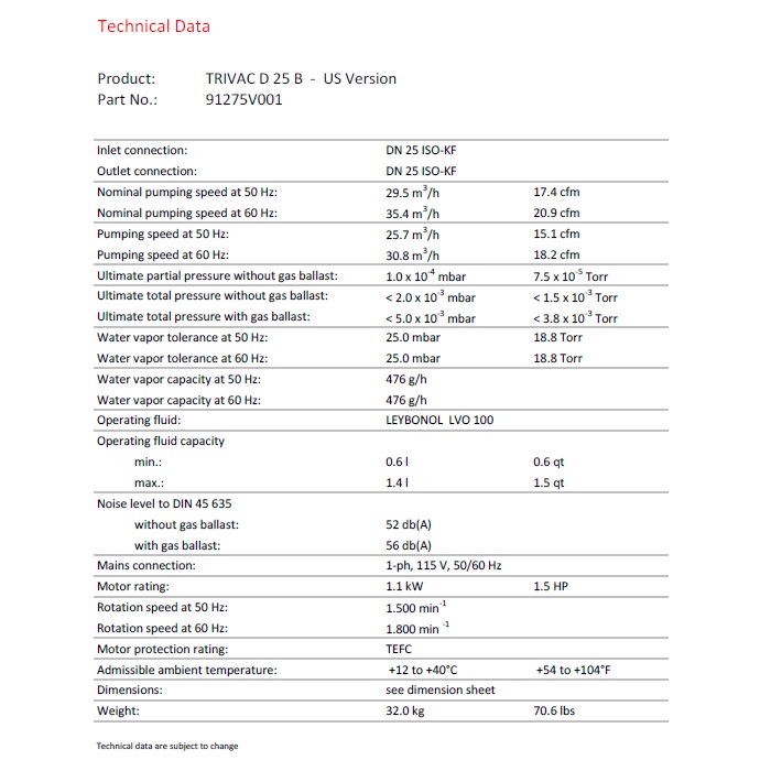 The LEYBOLD TRIVAC D25B vacuum pumps are oil lubricated vacuum pumps. Each Leybold D25B pump 11335 is wire wired for low 230V 50/60 Hz Voltage. The Leybold D 25 B is a well know pump with excelent reputation for vapor handling capability. The Leybold D25B pump has two vacuum stages with low vacuum and high vacuum which provided excelent ultimate vacuum pressure at < 2.0x10-3 mbar or <1.5x10-3 Torr. The Leybold D25B is perfectly suitable for many laboratory and research applications such as turbo pump backing pumps, diffusion pump backing pump, vacuum ovens, vacuum pumps for mass spectrometers, vacuum research laboratories, research projects. This Leybold D 25 B pump is prepared for Hydrocarbon oil service, best vacuum pump oil to be used is Leybonol LVO 100 / PN16787, D8 oil requirement 0.5 L min, 1.0 L max. The TRIVAC D25 Pump has grate water vapor capacity of 476 g/h.