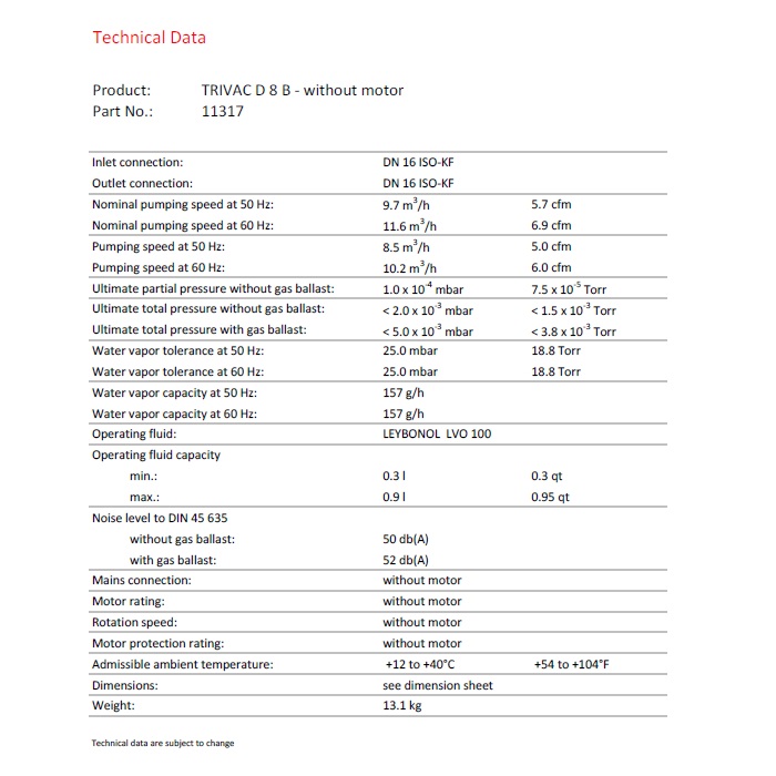 The Leybold D 8 B is a well know pump with excelent reputation for vapor handling capability. The Leybold D8B pump has two vacuum stages with low vacuum and high vacuum which provided excelent ultimate vacuum pressure at < 2.0x10-3 mbar or <1.5x10-3 Torr. The Leybold D8B is perfectly suitable for many laboratory and research applications such as turbo pump backing pumps, diffusion pump backing pump, vacuum ovens, vacuum pumps for mass spectrometers, vacuum research laboratories, research projects. This Leybold D 8B pump is prepared for Hydrocarbon oil service, best vacuum pump oil to be used is Leybonol LVO 100 / PN16787, D8 oil requirement 0.3 L min, 0.9 L max. The TRIVAC D8 Pump has grate water vapor capacity of 157 g/h.