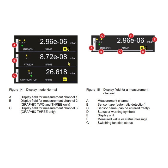 Universal 2 channel display and operating unit with persistent display of all measurement channels, suited for the active sensors of the THERMOVAC, CERAVAC, linear sensors (DU series), PENNINGVAC and IONIVAC series.