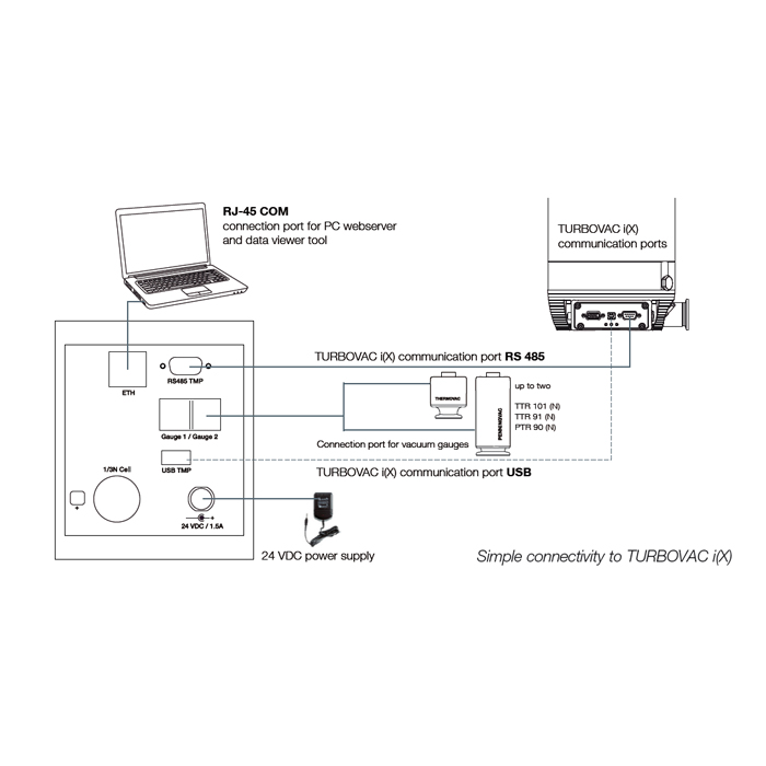 The Leybold TURBO CONTROL i serves to control and monitor a TURBOVAC i and TURBOVAC iX turbomolecular pump. Only one pump can be controlled and monitored. The 24 VDC voltage supply can be provided by a plug power supply with round plug. The power supply unit is available as an accessory. The Leybold TURBO CONTROL i has two communication channels (RS 485 & USB) to the pump control and provides the possibility of attaching two measuring gauges. Leybold Turbo Control can be connect a remote computer via the integrated Ethernet port to the web server of the TURBO-CONTROL i. Then use the installed internet browser to control and monitor the pump. The recorded data can be displayed and evaluated by means of the external Tool DataViewer. The Leybold TURBO-CONTROL i contains a battery (button cell) for data buffering, and can be installed in a rack or be mounted in a table housing provided for it. The table housing is available as an accessory.
