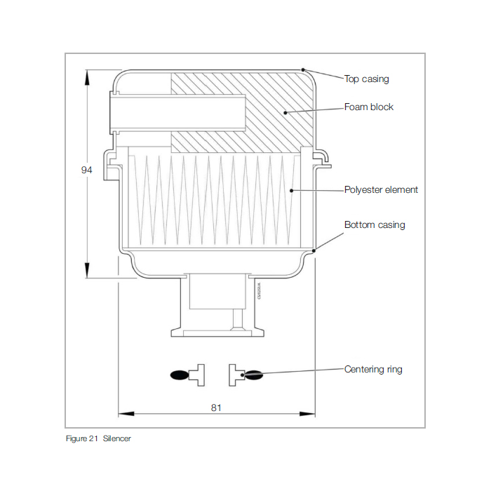 The SCROLLVAC plus silencer has been manufactured with an NW 25 fitting to enable fitting to the SCROLLVAC plus pump exhaust. An NW 25 clamp and centering ring are included.