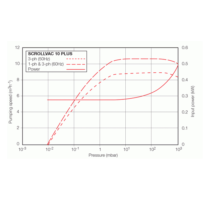 available as an accessory. All surfaces of the ScrollVac 10 pump which are exposed to the pumped gases are free from copper, zinc and cadmium. Exposed components include: anodised, aluminium scrolls, aluminium housing, nickel-plated inlet and exhaust ports, PTFE composite tip-seals, various stainless steel parts and fluorocarbon elastomer seals. Other materials of construction not exposed to vacuum include steel, copper, hydrocarbon lubricant and chemically resistant polymers.