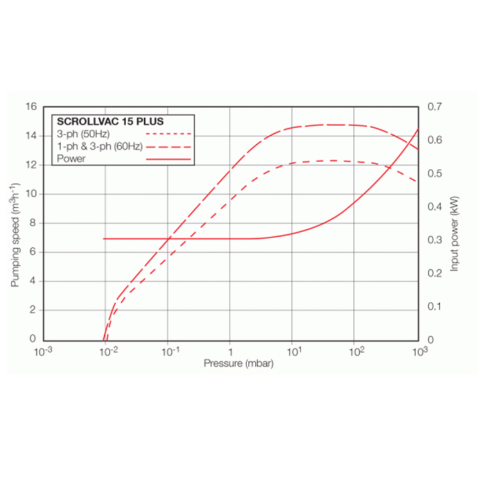 The ScrollVac 15 features Gas ballast control to pump high vapour loads, gas ballast can be delivered into the pump to prevent condensation of the vapour carried by the pumped gases. Air can be introduced to the low vacuum stages through the gas ballast control (Manual Figure 1, item 3). Alternatively, an inert gas such as nitrogen can be supplied through a suitable external valve and by using the appropriate adaptor, available as an accessory. All surfaces of the ScrollVac 15 pump which are exposed to the pumped gases are free from copper, zinc and cadmium. Exposed components include: anodised, aluminium scrolls, aluminium housing, nickel-plated inlet and exhaust ports, PTFE composite tip-seals, various stainless steel parts and fluorocarbon elastomer seals. Other materials of construction not exposed to vacuum include steel, copper, hydrocarbon lubricant and chemically resistant polymers.