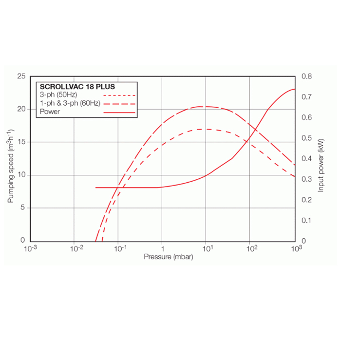 available as an accessory. All surfaces of the ScrollVac 18 pump which are exposed to the pumped gases are free from copper, zinc and cadmium. Exposed components include: anodised, aluminium scrolls, aluminium housing, nickel-plated inlet and exhaust ports, PTFE composite tip-seals, various stainless steel parts and fluorocarbon elastomer seals. Other materials of construction not exposed to vacuum include steel, copper, hydrocarbon lubricant and chemically resistant polymers.