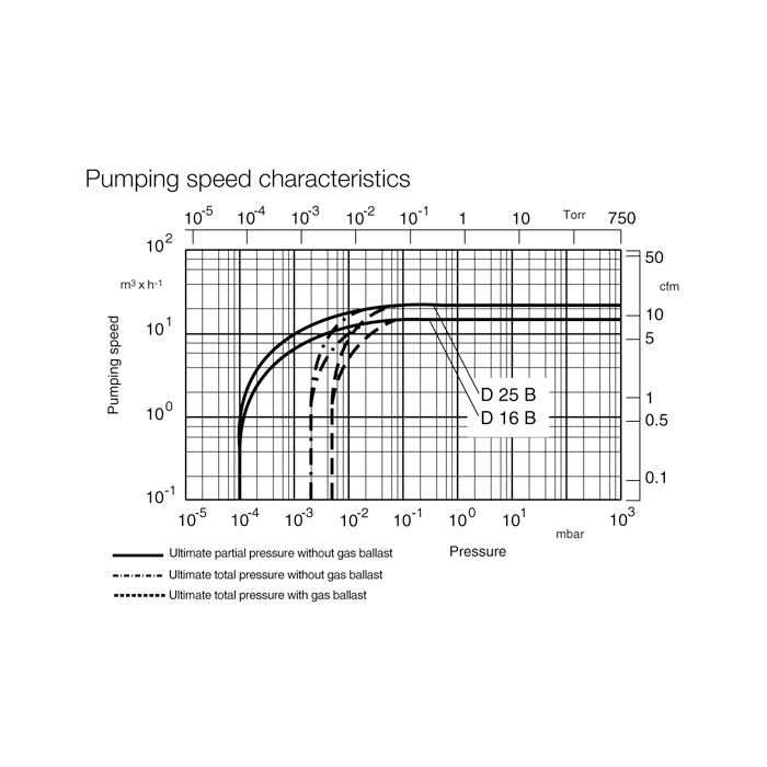 | Ultimate total pressure with gas ballast (50Hz | 60Hz) | < 5 x 10-3 mbar (< 3.8 x 10-3 Torr) | < 5 x 10-3 mbar (< 3.8 x 10-3 Torr) |