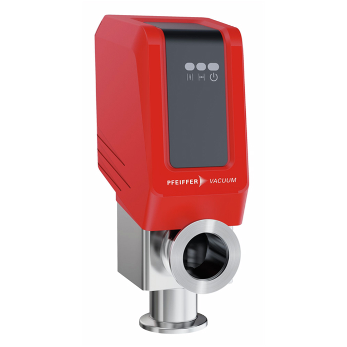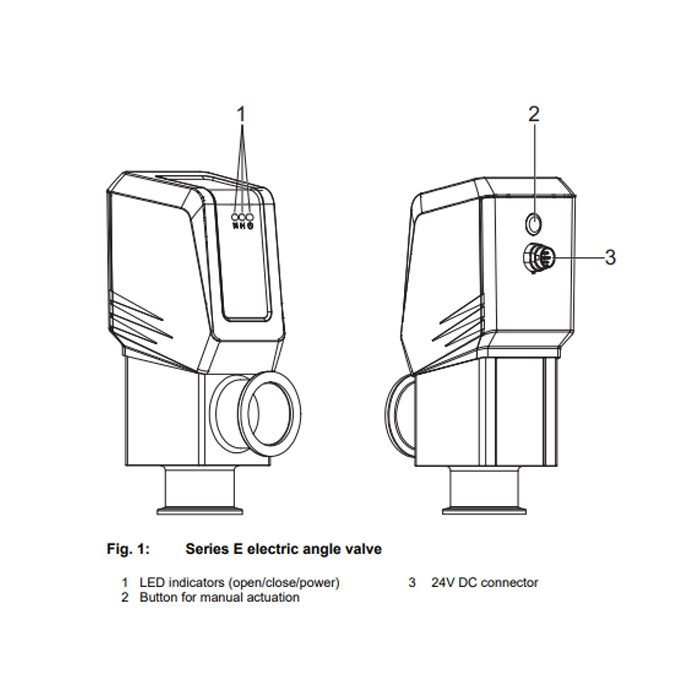 The Pfeiffer valve operates with a 24V DC supply voltage. When control voltage is applied, the electric actuator opens the angle valve, and the “Open” LED illuminates white to indicate the valve is open. When the control voltage is removed, the actuator closes the valve, and the “Closed” LED lights up white to confirm the valve is closed.