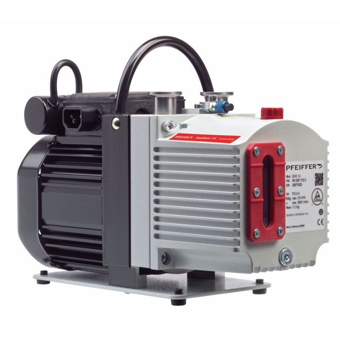 Pfeiffer DuoVane series rotary vane pumps are two-stage, oil-sealed rotary displacement pumps for use in a low and medium vacuum. The rotary vane pump is available in the standard version with claw coupling and asynchronous motor.