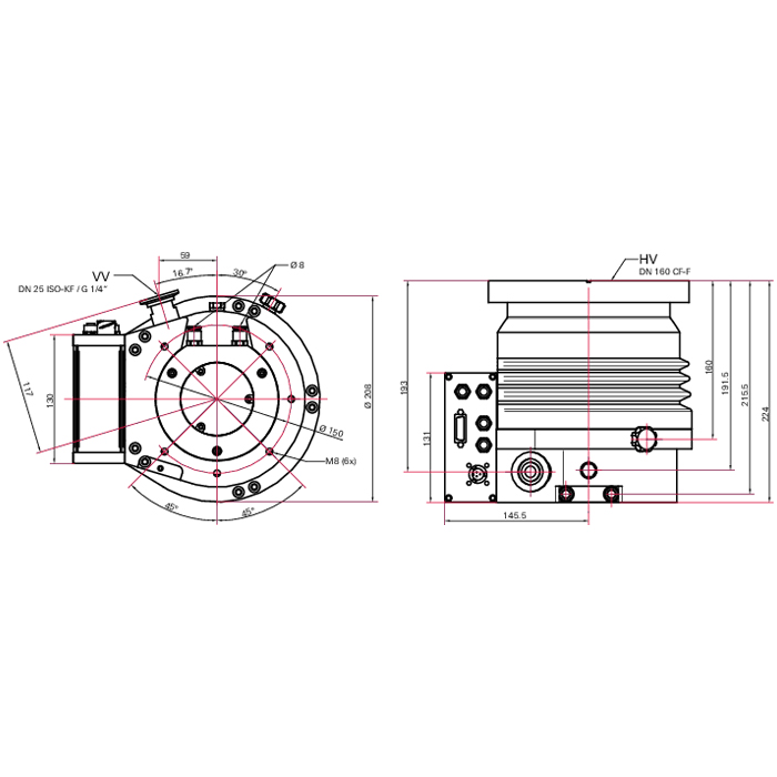 | Connection flange | DN 160 CF-F / DN 25 ISO-KF | G 1/4" Thread |