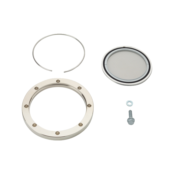 The mounting kit includes the collar flange and coated centering ring with splinter shield, as well as hexagon bolts.