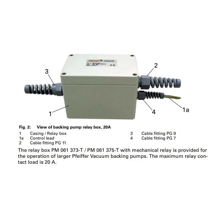 The Relay box PM 061 373-T / PM 061 375-T with Mechanical relay is provided for the operation of larger Pfeiffer Vacuum backing pump. The maximum relay contact load is 20 A