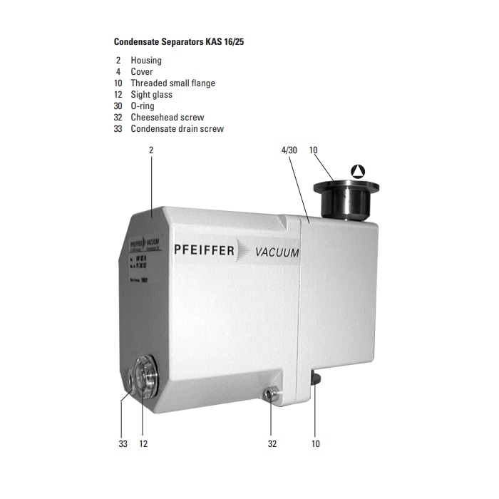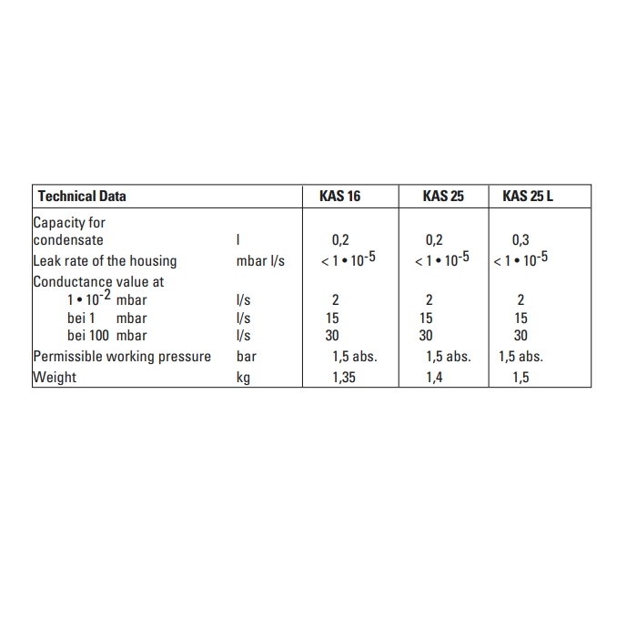 The Pfeiffer Vacuum KAS25L protects the pump against the damaging effects of condensates, the fitting of a condensate separator in the intake line of a vacuum pump is recommended.