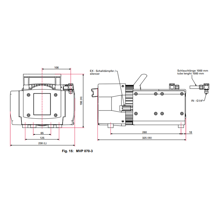 The diaphragm vacuum pumps of the series MVP 070-3 are three stage and those of the MVP 040-2 series are two stage, dry compressor vacuum pumps. The pumps are positive displacement pumps with a periodic change of size of the suction chamber produced by the movement of the diaphragm. The gas flow causes the valves to open and close automatically. The pump units are directly connected to the drive motor.