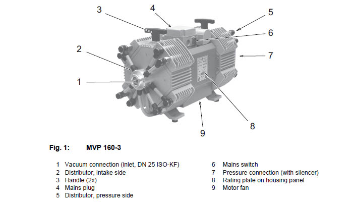 The diaphragm vacuum pumps of the series MVP 160-3 are high-performance dry compressor vacuum pumps with 8 pumping stages and pumping speed of up to 10.4 m3/h. The pumps are positive displacement pumps with a periodic change of size of the suction chamber produced by the movement of the diaphragm. The gas flow causes the valves to open and close automatically. The pump units are directly connected to the drive motor.