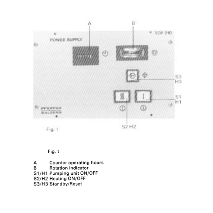The TCP 310 has easily accessible controls arranged on the front panel. The standby function option permits the Turbo molecular Pump to be operated at 66% of its rated speed. This results an extended service life of the bearings and reduction in noise and vibration. Connections for remote control and heating and cooling are available. Computer connections for data collection are optional. An electronic drive unit is employed to drive and control the turbo pumps. It is designed for 110 to 240 volts and 50 to 60 Hz without changeover and reversing. The mains filter of the TCP suppresses interfering pulses towards the mains.