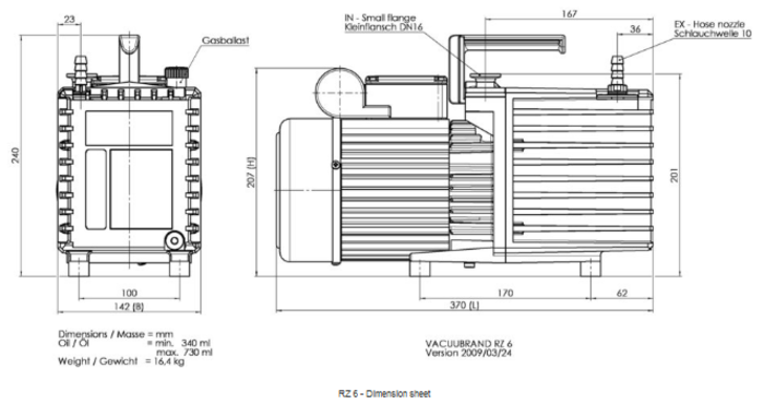 The Vacuubrand RZ 6 dry vacuum rotary vane pumps. The max pumping speed up to 4 CFM at 60 Hz. Vacuubrand (20698136) has the nominal rotation speed 1800 min-1 at 60 Hz. The weight of Vacuubrand RZ 6 is 16.4 kg. Noise level Vacuubrand RZ 6 is 50 dB at 50 Hz.