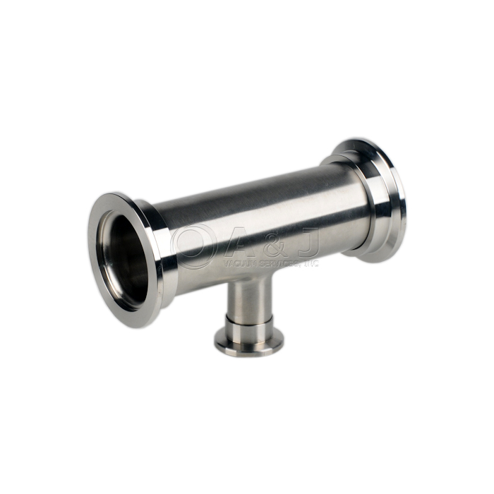 Unequal tees, branch reducers, are made out of stainless steel. These assemblies consist of two flanges, a centering ring, and an aluminum clamp. A uniform application of pressure on the clamp insures a vacuum seal. The mating flange surfaces compress the o-ring, which is held in place by a metal centering ring, to generate vacuum seal.