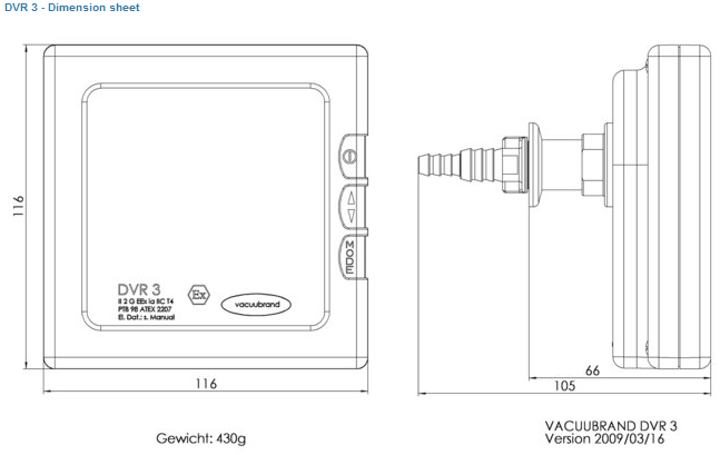 The Vacuubrand DVR 3 Vacuum Gauge is a portable, battery operated, fully electronic unit for the measuring range from atmosphere down to 1 mbar. For use in areas with potentialy explosive atmosphers (measured gas and enviroment of gauge)