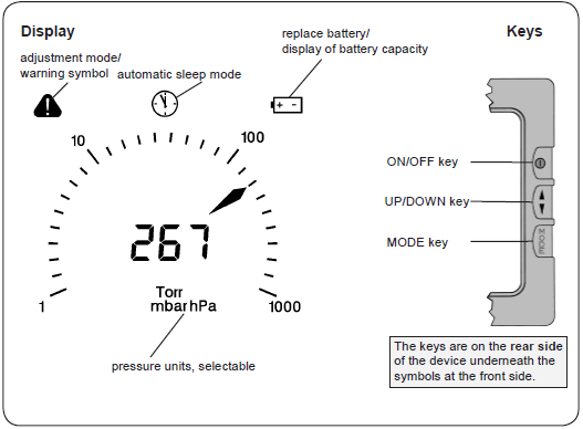 | Accuracy of measurement | < +- 1 mbar/hPa/torr / +- 1 digit (after adjustment, constant temp.) | |