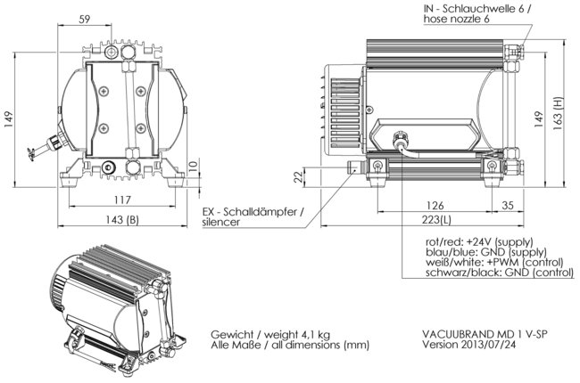 The three-stage Vacuubrand MD1 VARIO-SP diaphragm pump with its variable speed drive system, attains significantly higher pumping speed and a better ultimate vacuum than the corresponding fixed speed pump. The brushless 24V DC motor (maintenance-free) enables easy integration of the pump into other equipment, and operation independent of line voltage.