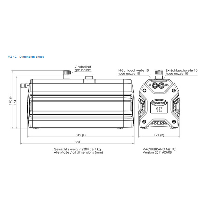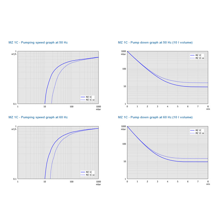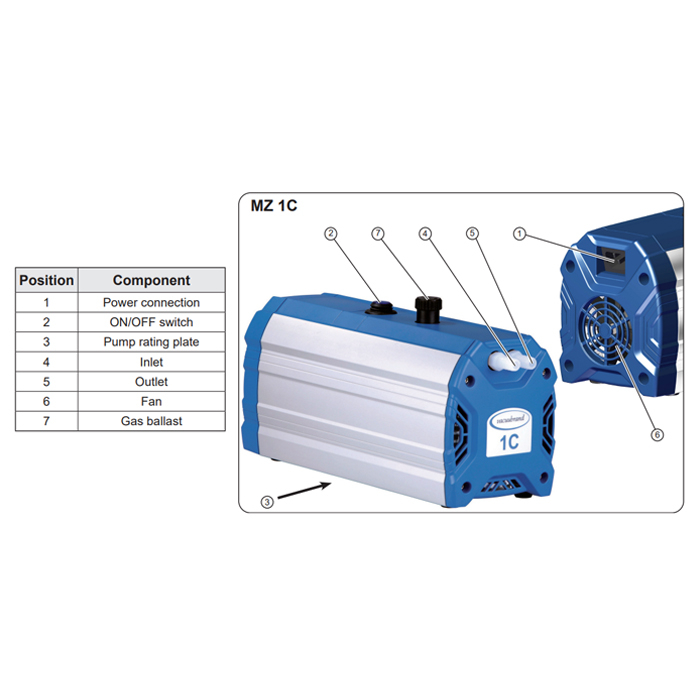 The MZ 1C pump is equipped with a gas ballast valve for continuous condensate purge increasing the pumping capability of condensable vapors. It features slim design for space-saving installation and good vacuum performance. A manual vacuum regulator valve with dial gauge for adjustment of pumping speed and ultimate vacuum is available as accessory.