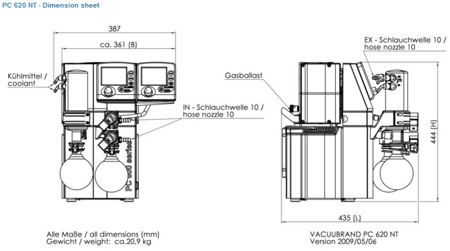 PC 620 NT is equiped with analog vacuum display. PC 620NT is also equipped with the waste vapor condenser at the outlet (EK) Vacuubrand vapor condenser is very compact and highly efficient.