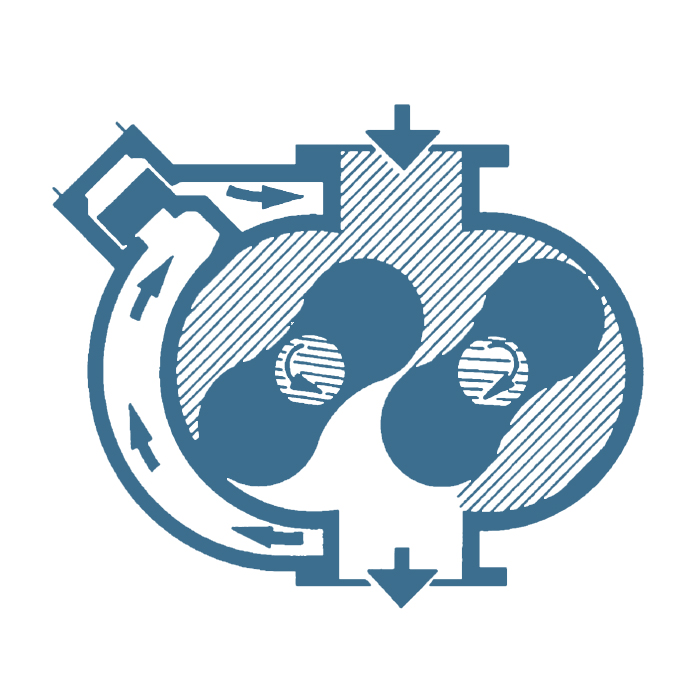 Roots pumps – also known as Roots blowers – contain in their pump casing (1/3) two symmetrical impellers (1/4) rotating in opposite directions. The impellers have roughly the cross section of a figure “8” and are synchronized by a toothed gearing so that they move past each other and the casing without contact but with a small clearance.