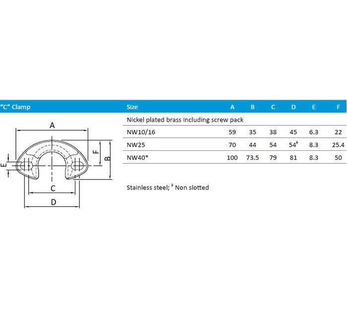 Edwards KF 10 (NW 10) C Clamp. These Clamps, manufactured by Edwards Vacuum, consist of stainless steel, and come with two screws, two nuts, and two washers.