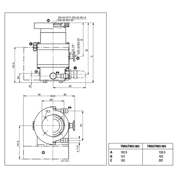 The Pfeiffer TMH064 / PM P02 361 and TMU models are identical in terms of their design. They only differ in their intake flange. Pfeiffer TMU 064 has a DN-63 CF Conflat Flange. The Volume Flow Rate is N2: 30 l/s. Noise level Pfeiffer TMU 064 (PMP02361) is <50 dB. The weight of TMH064 is 3.6 kg.