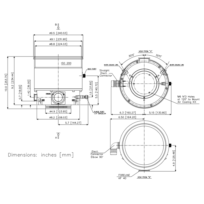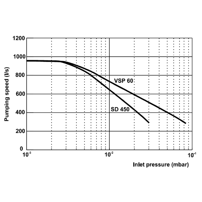 The pump can operate in any position and can be supported on the high vacuum flange or on its base. The connection of the forevacuum on the side of the pump is a KF 40 flange.