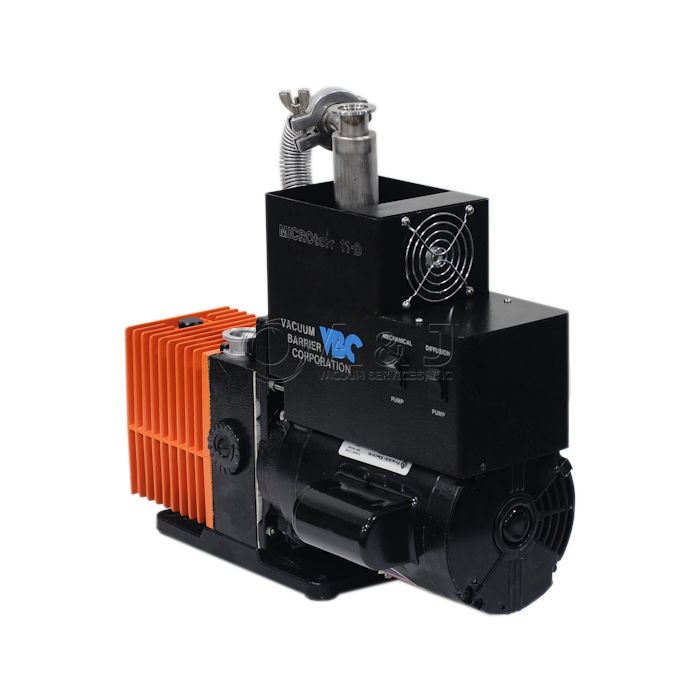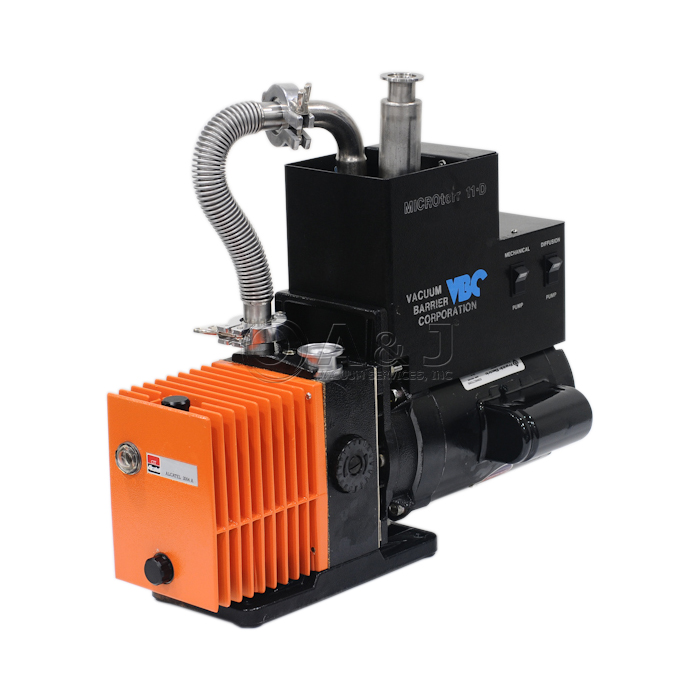 Fully Refurbished VBC Microtorr11 Diffusion Pump System with Alcatel 2004 A Dual Stage Rotary Vane Pump coupled with a KF-25 Inlet Flange and KF-25 Outlet Flange. This Alcatel Rotary Vane Pump has a peak pumping velocity of 3.2 cfm and a final pressure of 1 x 10-3 Torr. It has been thoroughly examined and is ready for broad range of applications within the research and industrial industries.